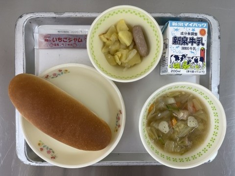 献立は、コッペパン、春野菜スープ、ウインナーポテト、いちごジャム、牛乳です。