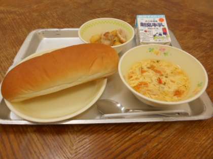 ♪今日の献立は、トマトとたまごのスープ・アドボ・牛乳でした。
