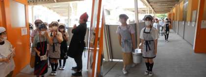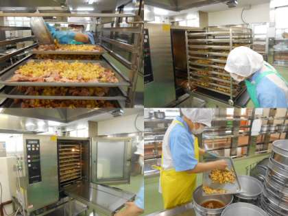 給食では、鶏肉やじゃがいもなどに調味液をかけて焼きました。