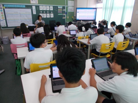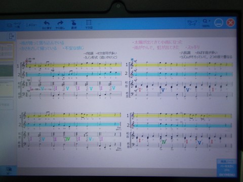 tabletに音の重なりで自分の考えを描いて,みんなで共有をしています。