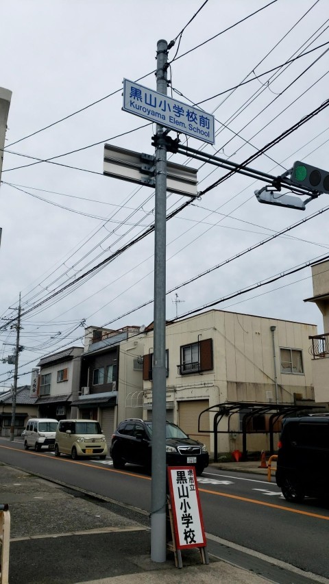 このたび、地域の皆様のご支援とご協力により、学校正門前の信号機に「黒山小学校前」と記載された看板を設置していただくことができました。