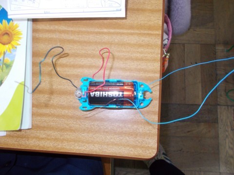 実験道具を作り,電気を通すもの,通さないものを予想しながら実験をしていました。