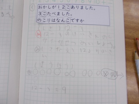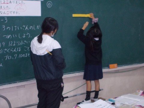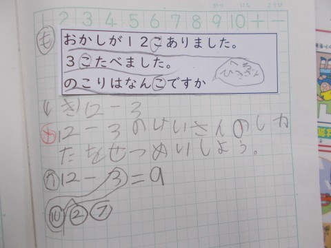 ブロック,ドット図,サクランボ図など,自分が考えた方法で問題を解いています。