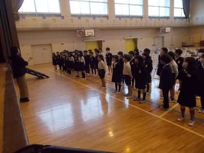 6年生を送る会の練習をしました。歌や言葉の練習です。音楽の先生から、歌のコツを教えていただきました