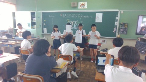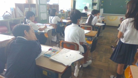 外国語の学習の様子です。班ごとに自己紹介文(できること)を英語で伝えて,それが誰なのかを考えていました。