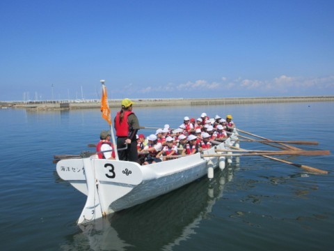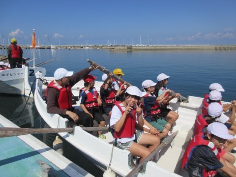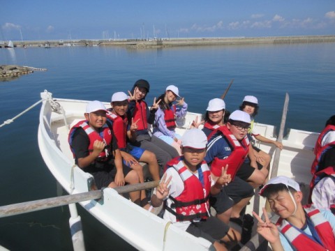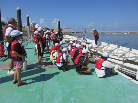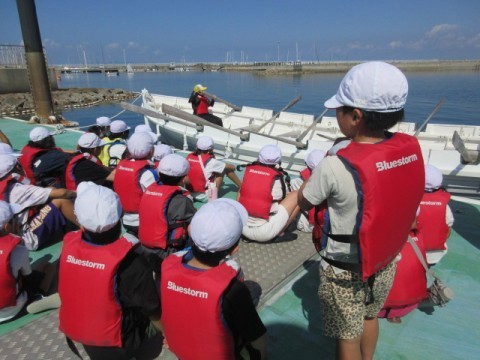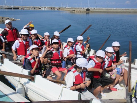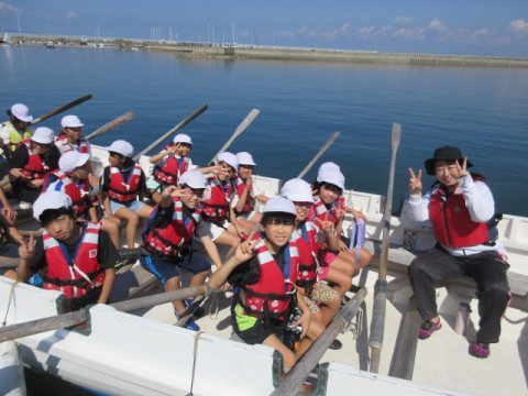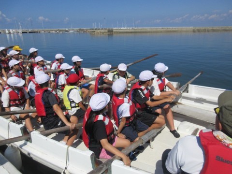 カッター活動の様子です。クラスみんなの力で一つの船を動かします。最初はなかなか進まなかった船も,みんなが力を合わせることによってぐんぐん進むようになりました。みんなで力を合わせることの大切さを学びました。