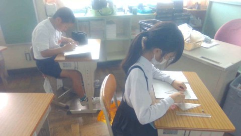 算数の学習の様子です。三角定規を使って『垂直』を書く練習をしています。