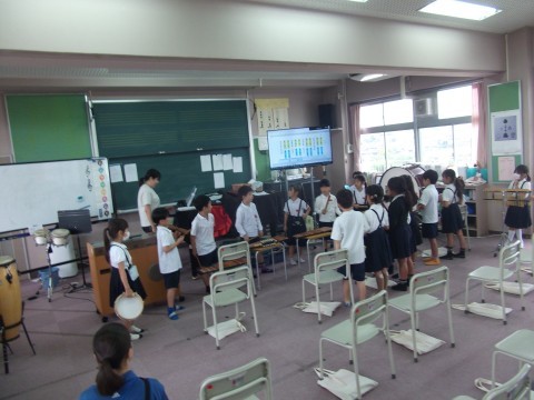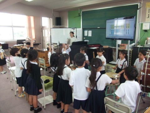 「おむすびころりん」のお話に合わせて,楽器を演奏していました。