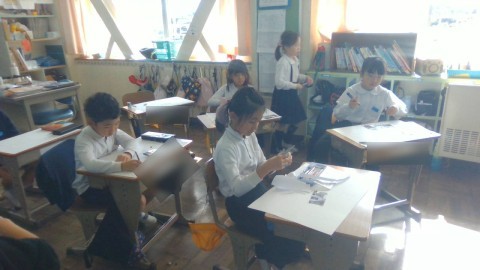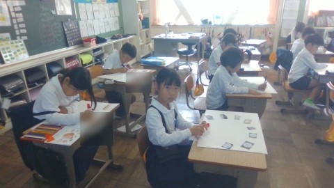 生活科の学習の様子です。「わたしのちかくのおすすめ」のものや場所を画用紙にまとめていました。
