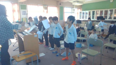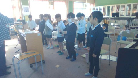 音楽の学習の様子です。はらぺこあおむしの物語に合わせて演奏や合奏をする練習をしていました。