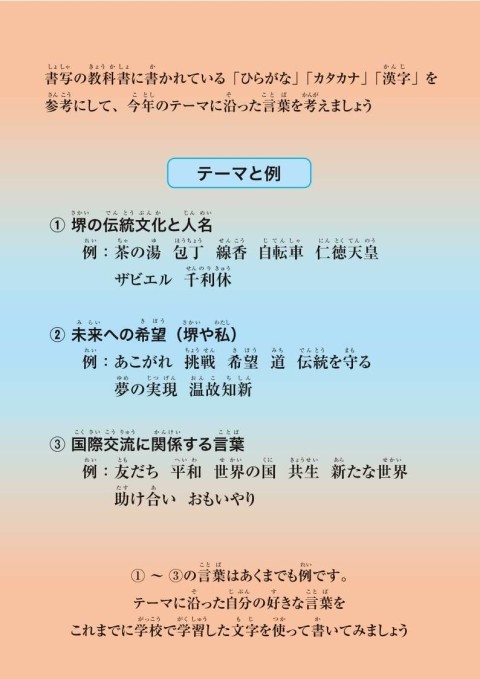 テーマ:「堺の伝統文化と人名」「未来への希望(堺や私)」「国際交流に関係する言葉」