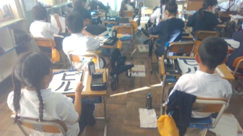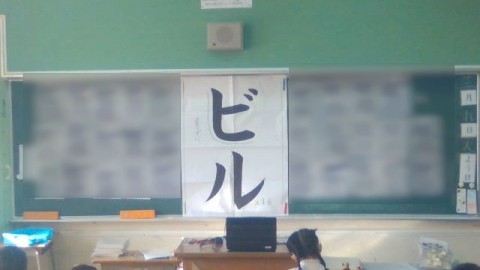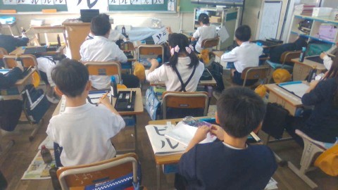 書写の学習の様子です。「ビル」の字を書いています。しっかりお手本を見て書くことが大事ですね。