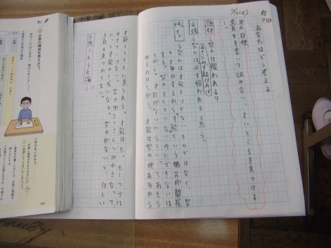 「努力は必ず報われるのか?」「失敗するのは悪いこと?」「あいさつは大事?」など題材を自分で決定し,その意見文を反論などを予想しながら書いていました。