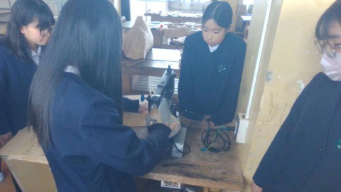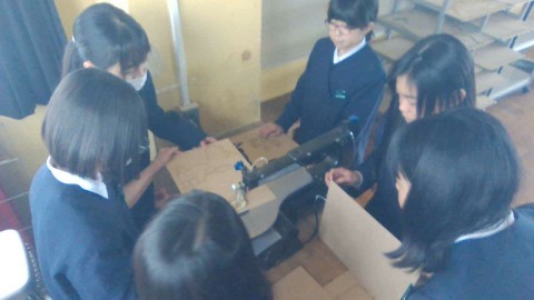 図工の学習の様子です。電動糸のこぎりを使って,『使える伝言板』を作っています。
