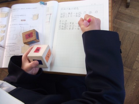 立方体や直方体の垂直な面や平行な面について考えていました。