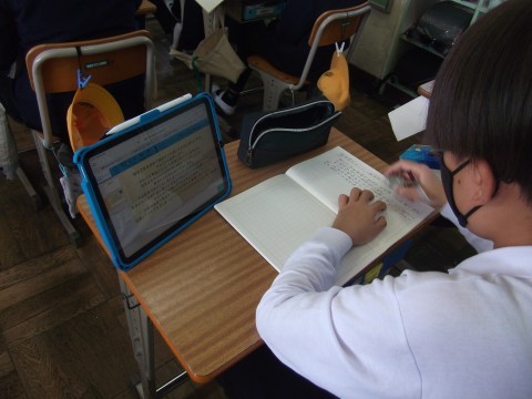 タブレットを使いながら,スピーチの原稿を作成していました。