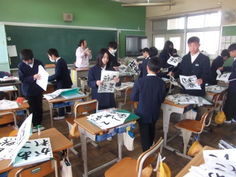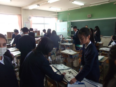 習字の作品をみんなで配りあっていました。