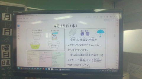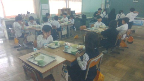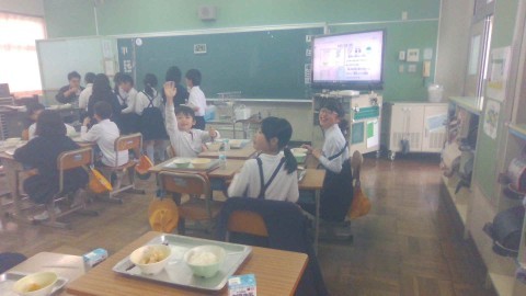 給食の時間の様子です。班机で友だちとおしゃべりをしながら、楽しそうに給食を食べていました。