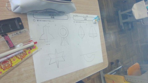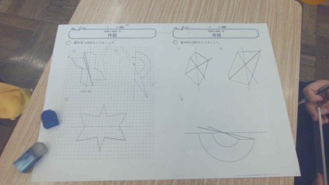 算数の学習の様子です。コンパスや定規を使い、点対称の図形を正確に作図する学習に取り組んでいました。