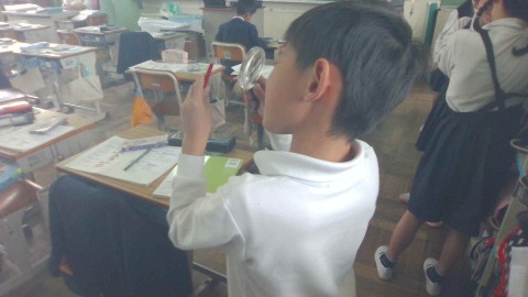 理科の学習の様子です。観察名人を目指して、虫眼鏡の使い方を練習しました。教室の中にあるいろいろな物を虫眼鏡で見て、小さい物がどのように見えるかを確かめていました。