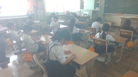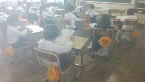 図工の学習の様子です。「はさみを正しく使って切ろう」をめあてに、画用紙に印刷された大きなこいのぼりを一つ一つ丁寧に切り、立派なこいのぼりを作っていました。