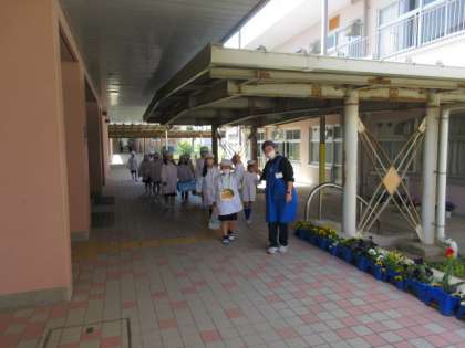 3年生は初めて中身の入った給食を調理場に取りに行きました。