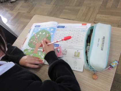 英語でいくつあるかの質問を聞き、数を数えて答えていました。