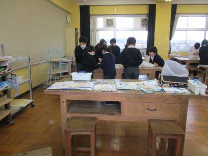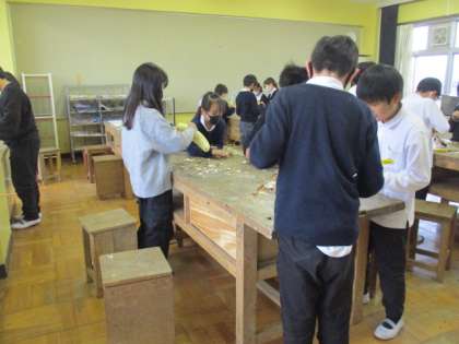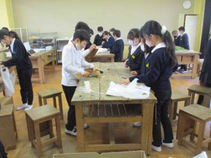 体育館の横で育てたヘチマから、たわしを作っています。