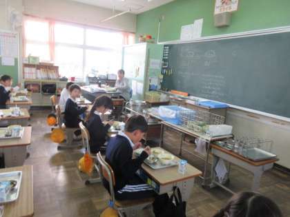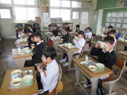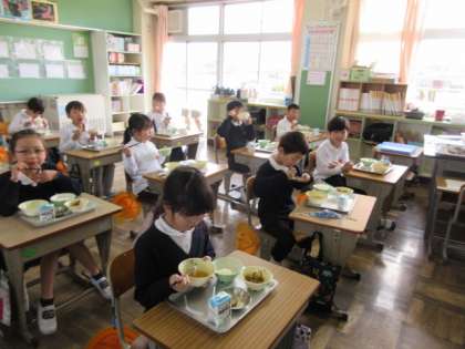 3月8日(金) 1組の給食の様子です。 みんな姿勢よく食べていました。