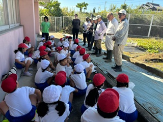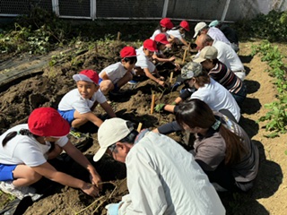 今日は、6月3日に、平尾校区コミュニティーの皆さんにお手伝いいただいて、苗を植えたサツマイモの収穫の日です。