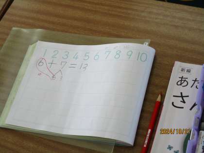 6+7の計算の仕方を、算数ブロックなどを使って説明しました。