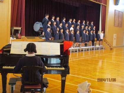 今日の児童朝会は、5年生の連合音楽会の壮行会をしました。