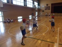 1組2組合同で体育をしました。赤コーンに玉を当てるために,みんなで作戦を考えてい...