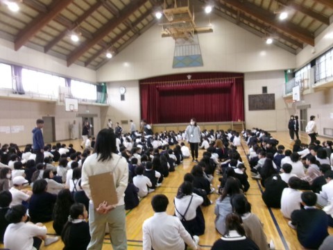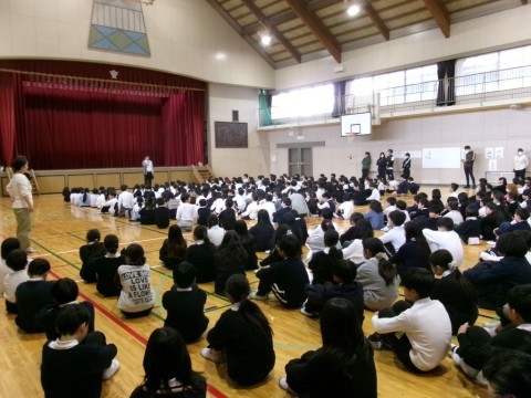 訓練後,体育館に集まり,不審者役をしていただいた元警察官の方から,今日の訓練についてのお話をしていただきました。