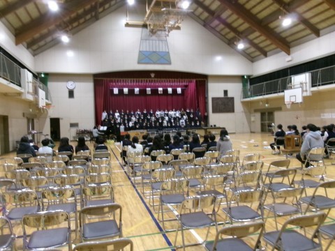 6年生が卒業コンサートの練習をしているところを5年生がお客として見学しています。