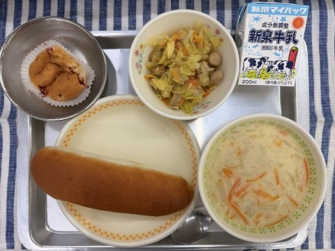 3月11日(水) 今日の給食は 公開日 2026/03/16 更新日 2026/03/16 学校給食・食育 今日の給食は ミニコッペパン 押し麦入り豆乳スープ ウインナーとキャベツのソテー イチゴのカップケーキ 牛乳 です。