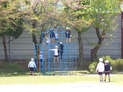 たくさんの子どもたちが運動場に出てきて、のびのびと活動しています。