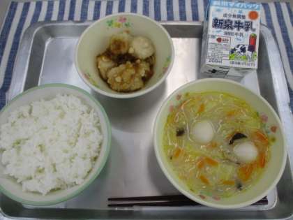 タイピーエンは、たっぷりの野菜と春雨が入ったパイタン風味のスープで、新献立になります。中国から熊本県に伝わり熊本市を中心に九州地方の多くの中華料理店で食べられています。豚肉宇治ら卵のほかに、色々な野菜が入っていて具沢山でおいしいですよ。