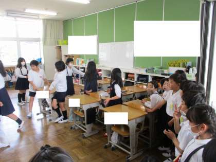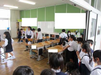4年生は普段は一人で机を運びますが、今日は、1年生のために二人で運ぶ方法のお手本をしていました。