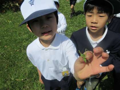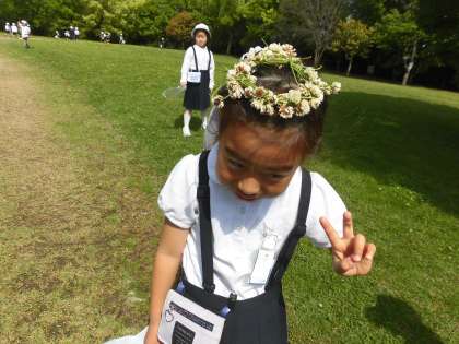 黒姫山古墳では、シロツメクサやたんぽぽ、てんとう虫やバッタなど、たくさんの植物や生き物を見つけていました。シロツメクサでゆびわやかんむりをつくっている人もいました。