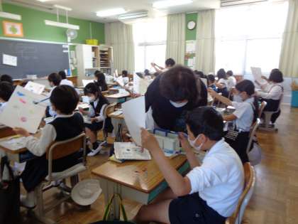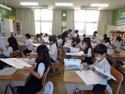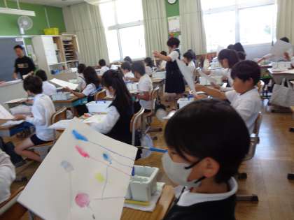 絵の具をつかって 4年生 公開日 2023/05/11 更新日 2023/05/11 4年生 絵の具にたっぷり水を含ませた筆をつかって・・・! 流れていくよ。 色も混ざるよ! 「めちゃくちゃになると思ったら、すごくきれい!」 と子どもたちの目が輝いています。