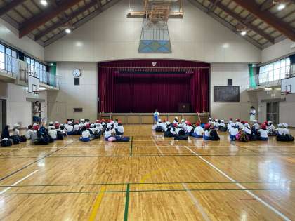体育館で実行委員会による出発式を行った後、いよいよバスに乗り込み出発です!