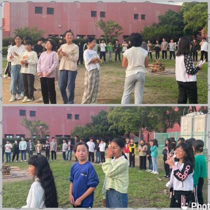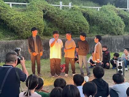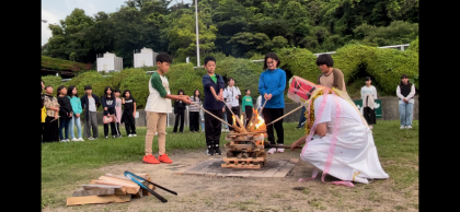 ?キャンプファイヤーの時間になりました。実行委員からのはじまりの言葉があった後、火の神様から火をもらい、キャンプファイヤーがスタートしました。