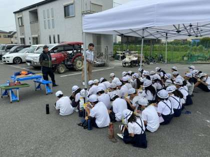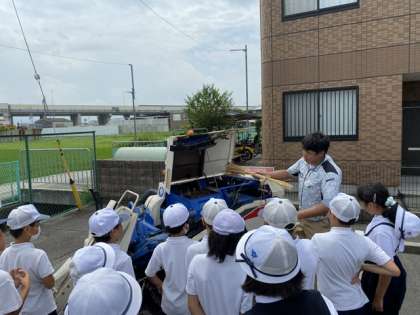 実際の米作りに使う機械を見せていただき、興味津々に動いているところを見ていました。