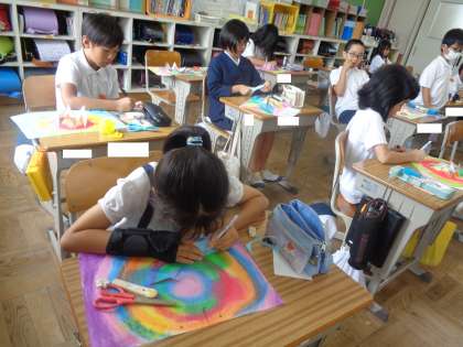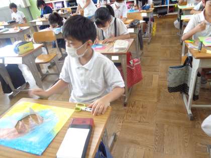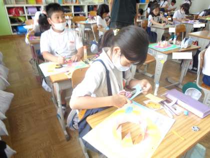 平面から立体に 4年生 公開日 2023/07/13 更新日 2023/07/13 4年生 一枚の画用紙をくりぬいて、四隅をたてて、写真たての完成です。 一枚に色を付けました。希望にあふれてくるようなきれいなデザインです。 真ん中に、お気に入りの写真が見えるように貼ります。 家に飾られるのが楽しみです。