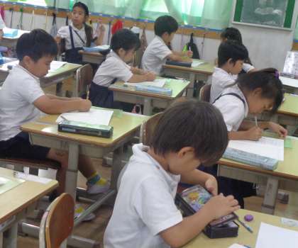 学級のようす 1年生 公開日 2023/07/14 更新日 2023/07/14 1年生 図書室で借りているのは夏休みに読む本でしょうか。 自分の好きな本を選べてとてもうれしいと報告してくれました。 算数の時間。問題を書き始めると、続きは自分で書けるよと言っている子どもたちもいました。絵を見て、問題をイメージすることができてきています。 算数の総まとめです。プリントを使って行っています。
