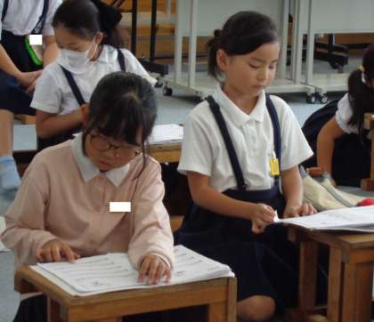 とっても速いテンポの曲を、楽譜を確認しながら聴く子どもたち。