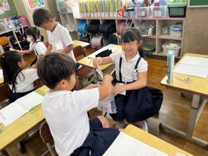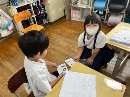 9月7日 1年生 公開日 2023/09/08 更新日 2023/09/08 1年生 今日の1年生の様子です。 算数では、10より大きい数の学習をしています。隣の人とカードを引いて、どちらのかずが大きいか考えました。 体育館では、サークルまとあての学習が始まりました。ボールを的に向かって投げる練習をしました。