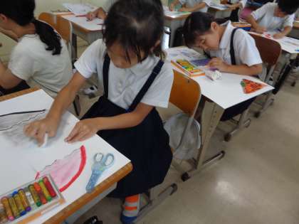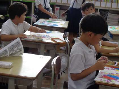 1年生2年生たちが、パスを使って絵を仕上げています。