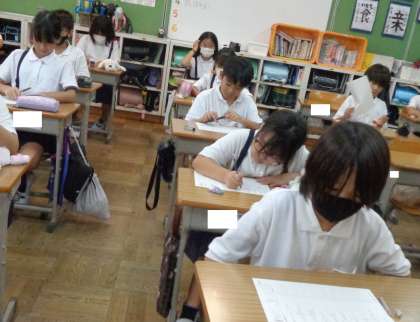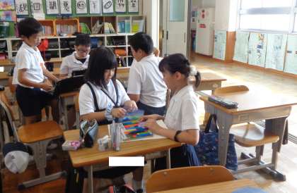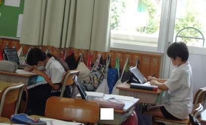 学校のようすを描いています。描きたい場所をタブレットで撮影して、教室で作品に仕上げています。
